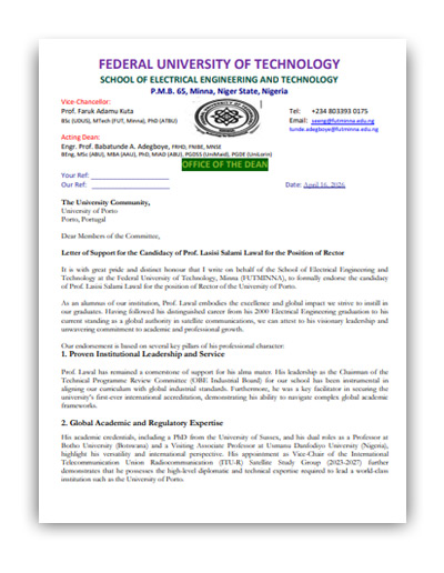 Letter of Support & Endorsement from Federal University of Technology Minna in support of Professor Lasisi Salami Lawal